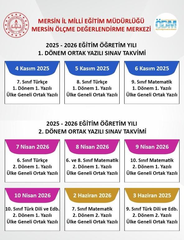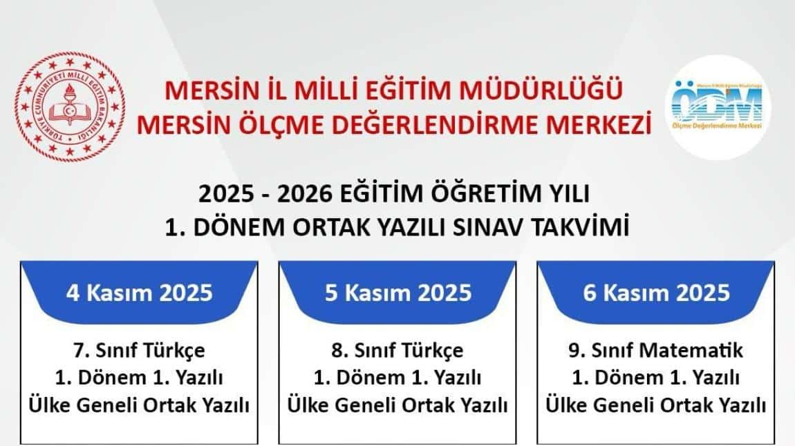 Mersin Ölçme ve Değerlendirme Merkezi 1. Dönem Ortak Sınav Takvimini Yayınladı. Sınav takvimine erişmek için tıklayınız.